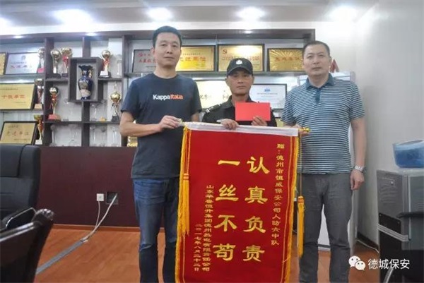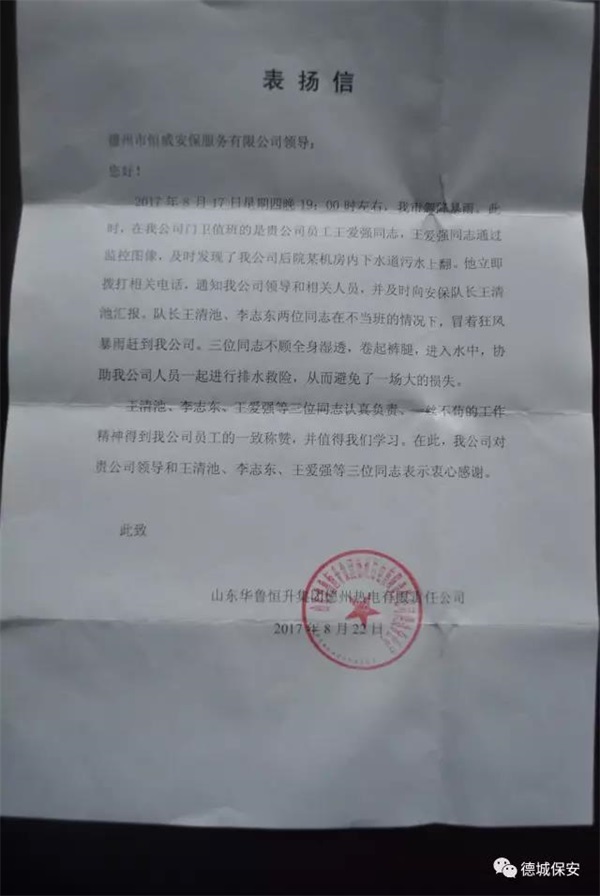 8月28日上午,山東華魯恒升集團(tuán)德州熱電有限責(zé)任公司安保部段主任在派駐保安執(zhí)勤班班長(zhǎng)王清池的陪同下,來(lái)到德州市恒威安保服務(wù)有限公司,感謝在8.17特大暴雨中及時(shí)排除重大險(xiǎn)情的三名保安隊(duì)員。贈(zèng)送“一絲不茍、認(rèn)真負(fù)責(zé)”錦旗一面、表?yè)P(yáng)信一封。