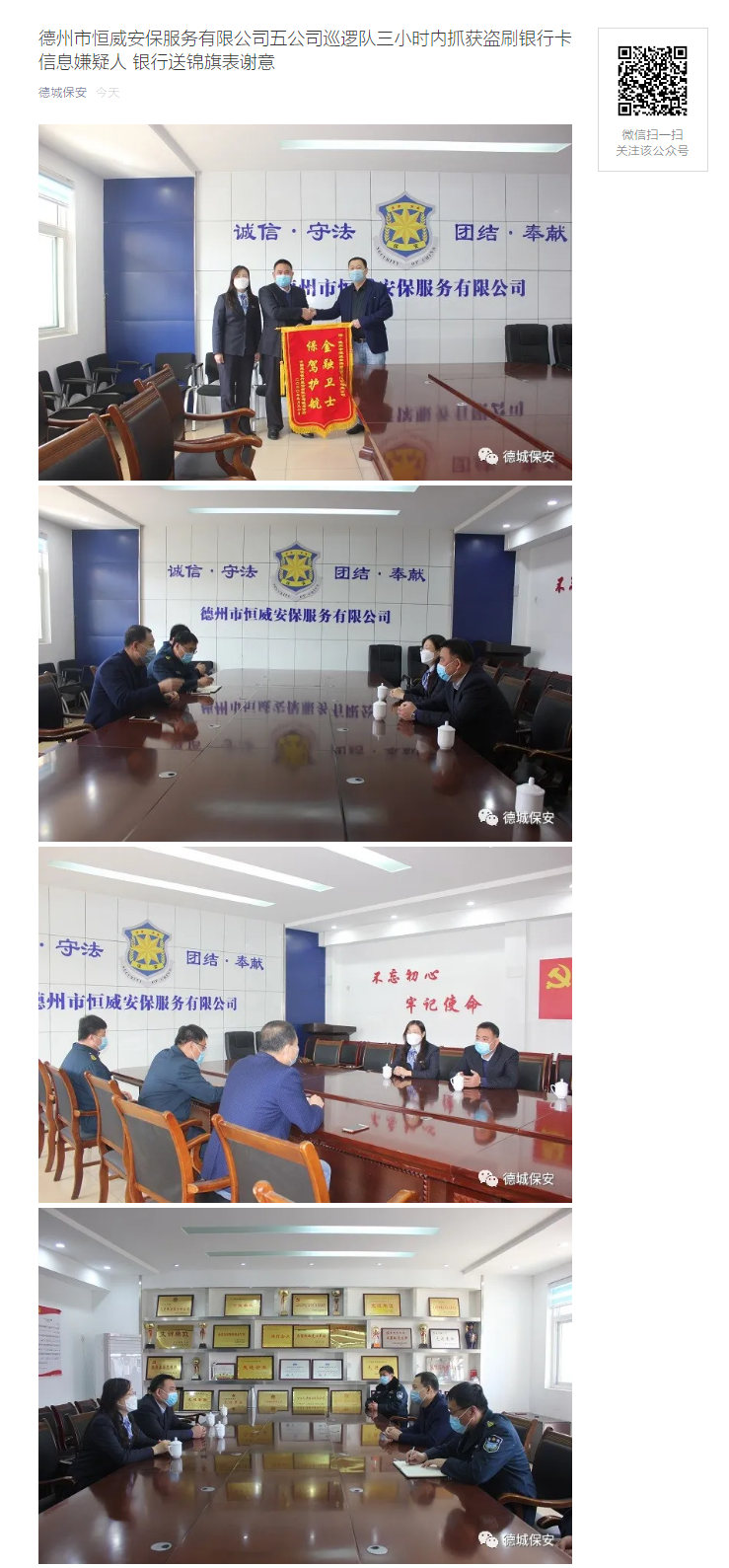 近日,恒威安保服務有限公司巡邏隊在巡邏時發(fā)現(xiàn)一男子在某銀行自助網點,安裝了銀行讀卡器和攝相頭,欲盜取銀行卡信息進行違法盜取現(xiàn)金。恒威安保公司五公司接到通知,五公司領導高印東、尹紀昌好時間趕到現(xiàn)場,迅速組織精干隊員,采取有力措施,僅三小時內便將涉嫌盜刷銀行卡信息的犯罪嫌疑人抓獲歸案。目前犯罪嫌疑人已被派出所刑事拘留。 為表達謝意,4月3日上午,銀行相關領導攜帶錦旗專程來到恒威安保公司,送上一幅書寫著“金融衛(wèi)士,保駕護航”的錦旗向抓獲犯罪嫌疑人安保人員致敬。公司總經理王新衛(wèi)接待了他們,并與他們交流了公司的安保情況,銀行相關領導對公司的管理規(guī)范和安保人員的素質給予了較高的評價。