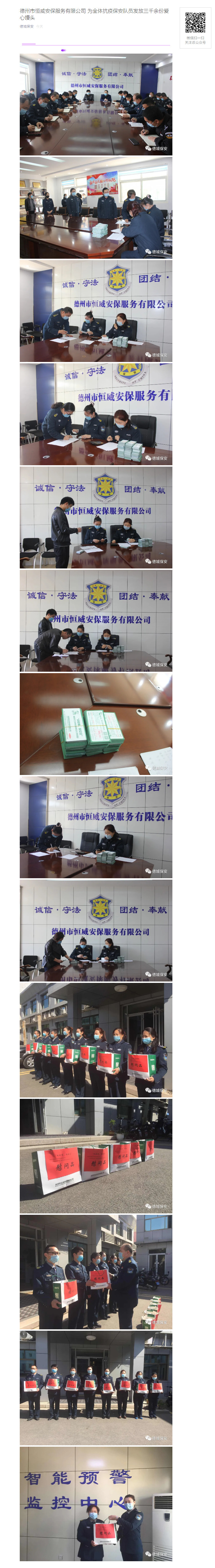 近日,德州市恒威安保服務(wù)有限公司為全體抗疫保安隊(duì)員發(fā)放慰問品愛心饅頭三千余份6萬余個(gè)。
